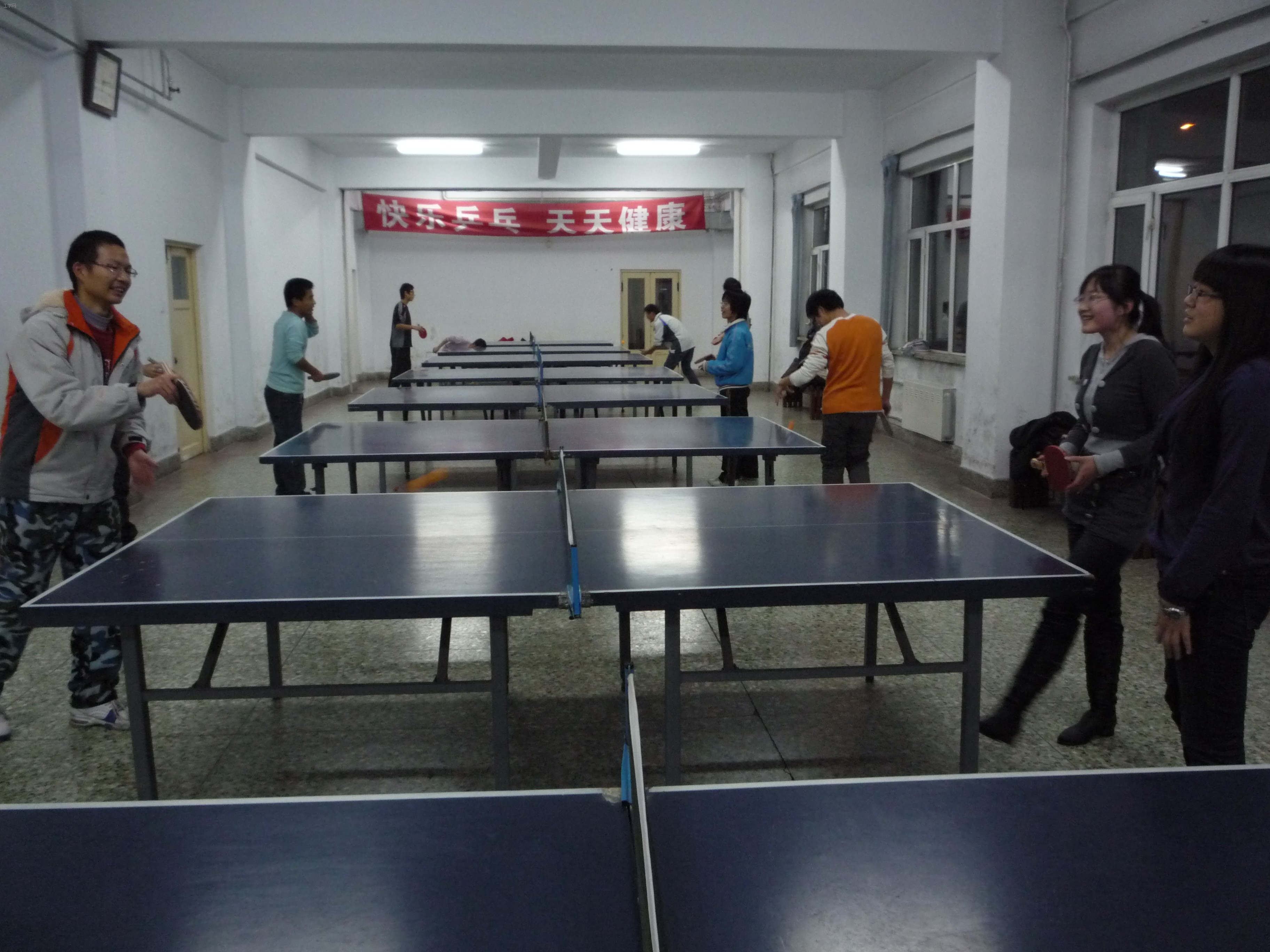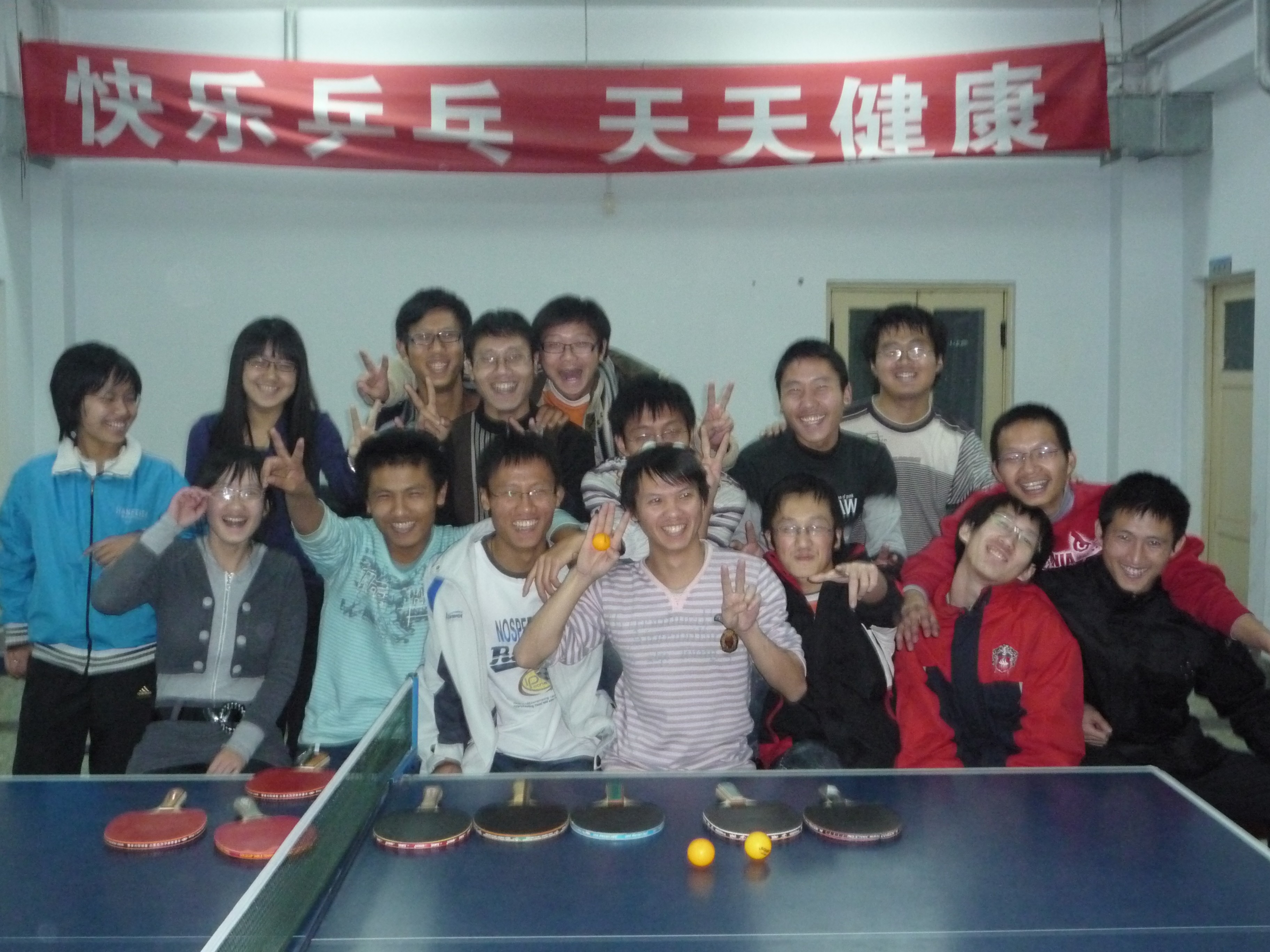 为促进班级交流,缓解学习压力,081011班于18日晚在校乒乓球馆组织了一次题为“快乐乒乓”的主题班活。