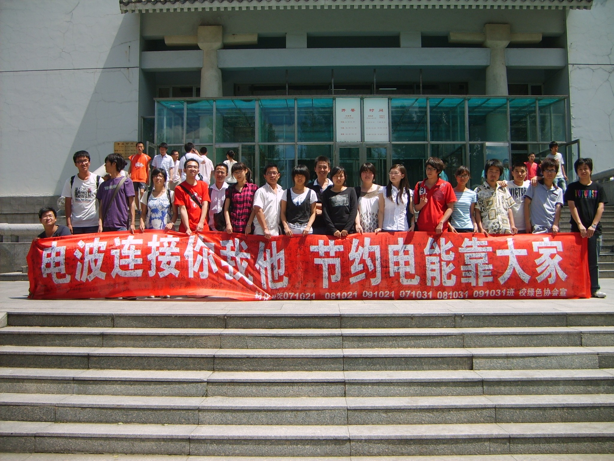 20日,公司081021班举办“电波连接你我他 节约电能靠大家”条幅签名活动。