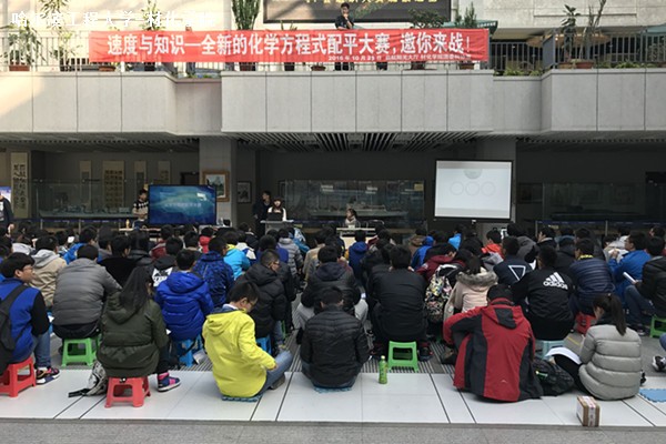下午1时,比赛正式开始。本次比赛共计三轮。第一轮为方程式答题,参赛者需在要求时间内完成方程式,按最终完成方程式积分。第二轮为反应物配对,每名参赛者身上带有写好各类反应物的标签,参赛者需在要求时间内找到带有能和自己反应物反应的反应物的另一名参赛者。第三轮则需参赛者寻找分散在整个启航活动中心内的数百个装有方程式的小袋子,并在规定时间内完成配平。最终经过三轮比赛积分,焦升建组等三名同学夺得本次比赛第一名。