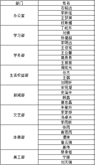 根据自愿报名,资格审查及民主评议答辩,经公司审核,2017-2018届团委、员工会副级员工干部拟聘任结果公示如下,如有异议请于9月6日10:00前到员工工作办公室(基础楼419室)反映。
