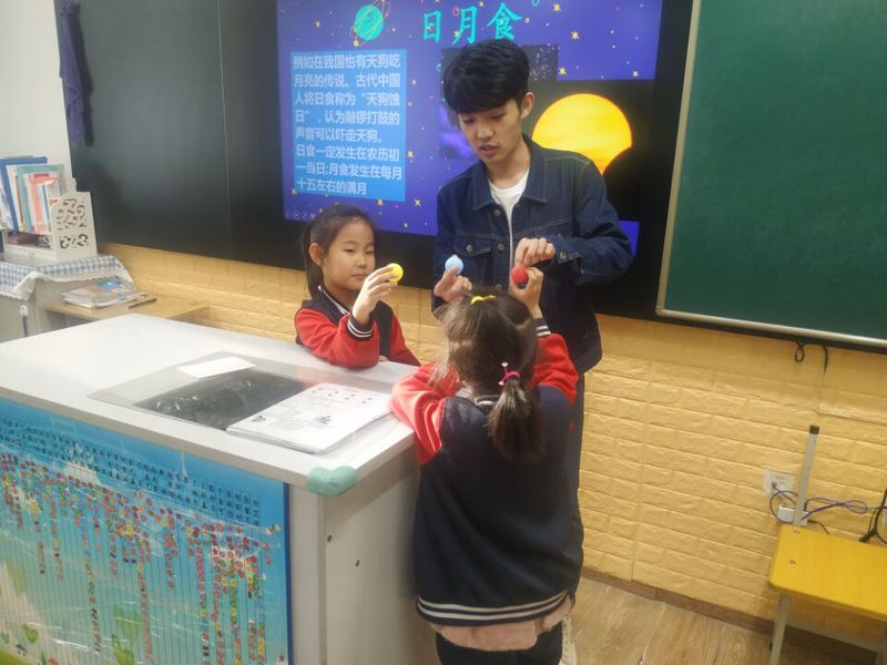 活动开始,主讲人首先以PPT的形式向小朋友们讲解了“天空中的星体”、“天空中的现象”、“人类的自然屏障”、“如何保护天空“这四个方面的知识。在“天空中的现象”这个环节,主讲人和小朋友们一起互动实验。希望小朋友们通过实验,了解日月食的原理,善于发现更多有趣的天文现象。在讲课以及互动环节,小朋友们反应热烈,积极参与活动。