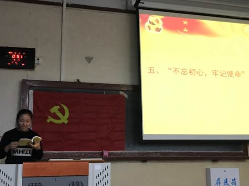 李冬瑞同志领学251页,并说到:我们就是要每天学习新知识,好好学习,牢记我们的初心和使命。