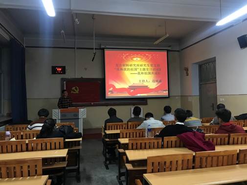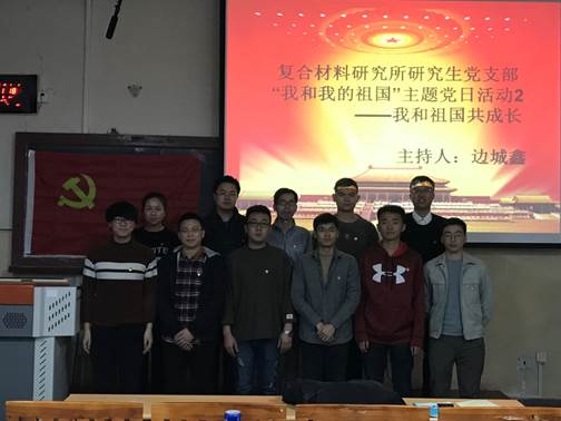 2019年10月24日,复合材料研究所研究生党支部全体正式党员在11#0151顺利召开了2019-2020学年第二次主题党日活动,主题为:我和我的祖国----我和祖国共成长。复合材料研究所全体员工党员参加此次大会。大会由复合材料研究所研究生党支部支部书记边城鑫同志主持。