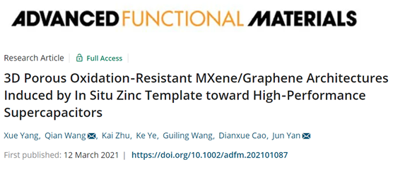 近日,MK体育闫俊教授课题组成功通过原位锌模板诱发构筑三维多孔抗氧化MXene/RGO复合材料,并对其超电容性能进行了研究。该研究成果已在《Advanced Functional Materials》发表。