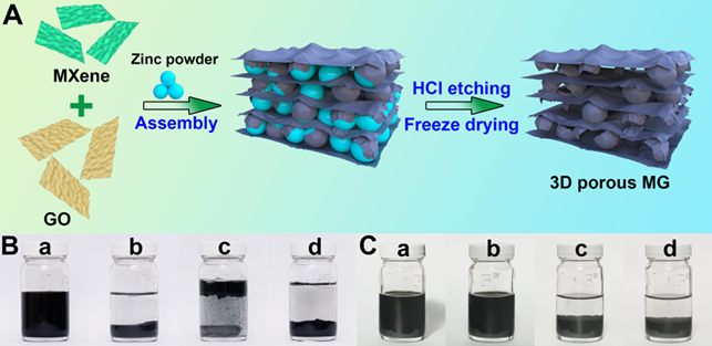 为解决该问题,闫俊教授课题组使用原位金属锌粉作为牺牲模板,在室温条件下通过自组装方法构建了三维多孔抗氧化MXene/RGO(PMG)复合材料,该方法实现了室温下通过简单有效的方法制备MXene复合材料,既使得MXene材料的性能得到了提升,又使其电导率长期保持稳定。目前,只有极少数的实验室在从事此项研究。该材料的成功制备为MXene作为电极材料的研究奠定了基础,同时,为MXene材料在储能领域的发展起到了推进的作用。此外,该材料有望在锂/钠离子电池、水净化、电磁屏蔽、生物医疗等领域获得广泛应用。目前,课题组正在积极开展MXene基复合材料的后续研究。