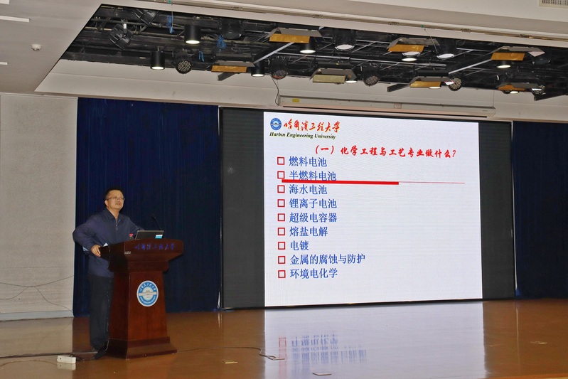 最后,王贵领教授详细地介绍化学工程与工艺这一专业。他讲到化学工程与工艺专业的学习内容、世界十大最新科技、公司电化学的发展历程与特色以及电化学工程专业与“三海一核”的关系。