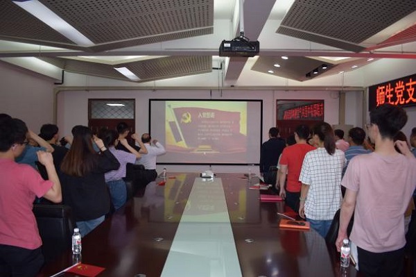 师生党员全体起立,重温入党誓词,共同宣誓,重温入党初心。