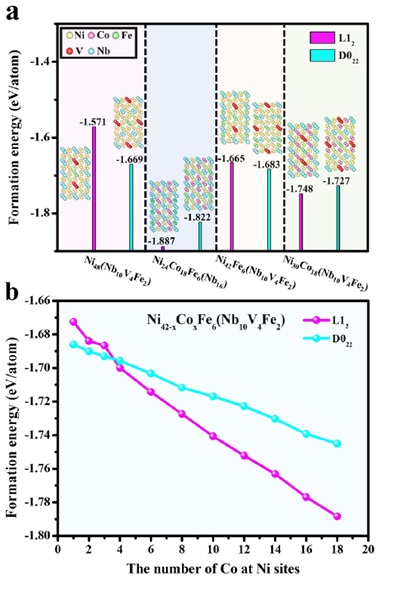 图 7. 成分对纳米相晶体结构的影响。(a) L12-Ni3Nb和D022-Ni3Nb结构的形成能与各种原子取代A或B位点的比较。(b) Co含量对L12-Ni3Nb和D022-Ni3Nb形成能的影响。