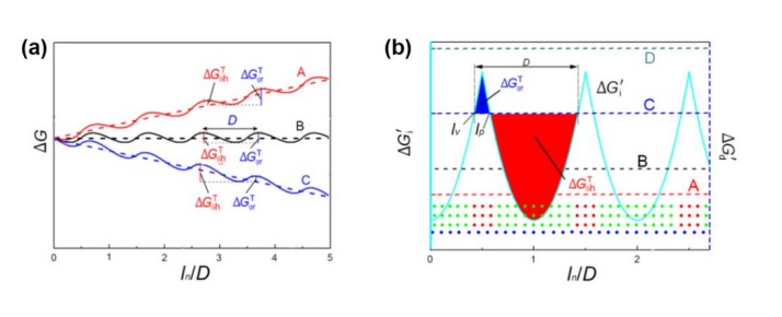图2 周期性表面能对于相变过程的影响:(a)不同驱动力条件下的相变长度对Gibbs自由能的影响。(b)相变长度对单层名义相变驱动力和单层名义相变阻力的影响。