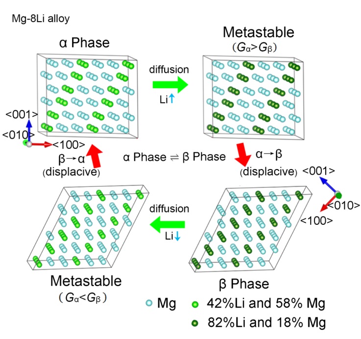为证实上述理论,研究团队以双相Mg-Li合金为研究对象,利用中子全散射分析α相和β相cell中最普遍原子排布。结果显示,双相Mg-Li合金的α相和β相中的cell具有相似的原子排布规律,在cell成分达到相变成分后,即可通过Burgers位移过程完成相变。(图3)实验结果显示双相Mg-Li合金中的扩散型相变过程是一种扩散控制的位移过程。
