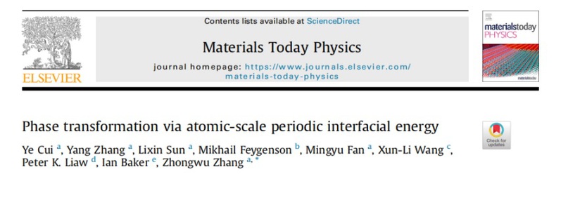 导读:传统观点认为扩散型相变和位移型相变是两种不同的相变,但是新相和母相之间的界面都具有恒定的界面能。近日,张中武教授团队提出了周期性界面能的概念,并基于此提出了新的扩散相变理论。理论认为,原子扩散是局限在以新相和母相界面的周期为单位的短程序单元(cell)中,当cell中的元素分布所积累的自由能高于以界面自由能为主的能垒时,母相以cell为单位整体切变成新相。因此,所谓的扩散型相变在原子级尺寸上也是一种位移型相变。该研究受到国家重点研发计划(政府间),国家自然科学基金等项目支持。该成果由Mksport体育、德国余利希研究所中子科学中心、香港城市大学、美国田纳西大学、美国达特茅斯公司合作完成,成果以“Phase transformation via atomic-scale periodic interfacial energy”为题发表在《Materials Today Physics》。Mksport体育为第一署名和唯一通讯作者单位,Mksport体育张中武教授为通讯作者,Mksport体育崔烨副教授为第一作者,Mksport体育张洋副教授、孙利昕副教授、德国余利希研究所中子科学中心Mikhail Feygenson博士、Mksport体育博士生范明雨、香港城市大学王循理教授、美国田纳西大学Peter K. Liaw教授、美国达特茅斯公司Ian Baker教授为共同作者。