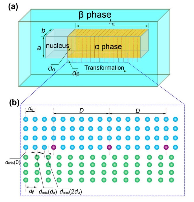 研究团队将周期性错配导致的界面能周期性变化带入Gibbs自由能公式,其结果如图2(a) 所示。可见周期性变化的界面能导致Gibbs自由能出现周期性亚稳态和周期性能垒。因此,这种相变通过需要从一个亚稳态长度到另一个亚稳态长度通过瞬间位移过程进行,而不能够逐层或逐个原子进行,即相变以由界面周期性决定的cell为单位进行。同时由于周期性能垒的出现,这种相变形核后仍需要热激活才能进行。可见,该相变过程是传统扩散型相变,而其本质却是一种位错过程。
