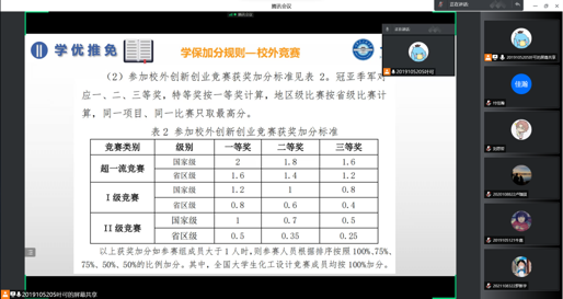 本次会议围绕着公司学优推免加分制度解读、竞赛库介绍以及科创竞赛注意事项等方面开展。会议开始,首先由叶可同学为参会者解读了“2022年推荐免试攻读硕士学位研究生加分细则”,“Mksport体育2022年度员工创新创业校外竞赛库”等相关政策内容。他强调,我们要充分了解公司的加分政策,心怀光明的未来,并为之奋斗。大一的同学以尝试为主,从引导型立项和启航杯入手,培养科创兴趣。大二的同学以实践为主,参加五四杯、互联网+等各项科创竞赛,知行合一,产学结合。此外,叶可同学还在本次分享会中分享了自己的科创经历,鼓励大家多与导师、辅导员以及学长学姐沟通交流,深入了解各项比赛的参赛规则,激发科研兴趣。