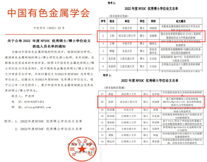 近日,中国有色金属学会正式公布2022年度中国有色金属学会(NFSOC)优秀硕士/博士学位论文奖评选结果,公司巫瑞智教授团队王阳博士学位论文《微合金化和累积叠轧对Al-2Li基材料微观组织及力学性能的影响》荣获优秀博士学位论文奖、徐林硕士学位论文《基于搅拌摩擦加工和轧制制备MWCNTs/Mg-14Li-1Al复合材料微观组织与力学性能研究》荣获优秀硕士学位论文奖。