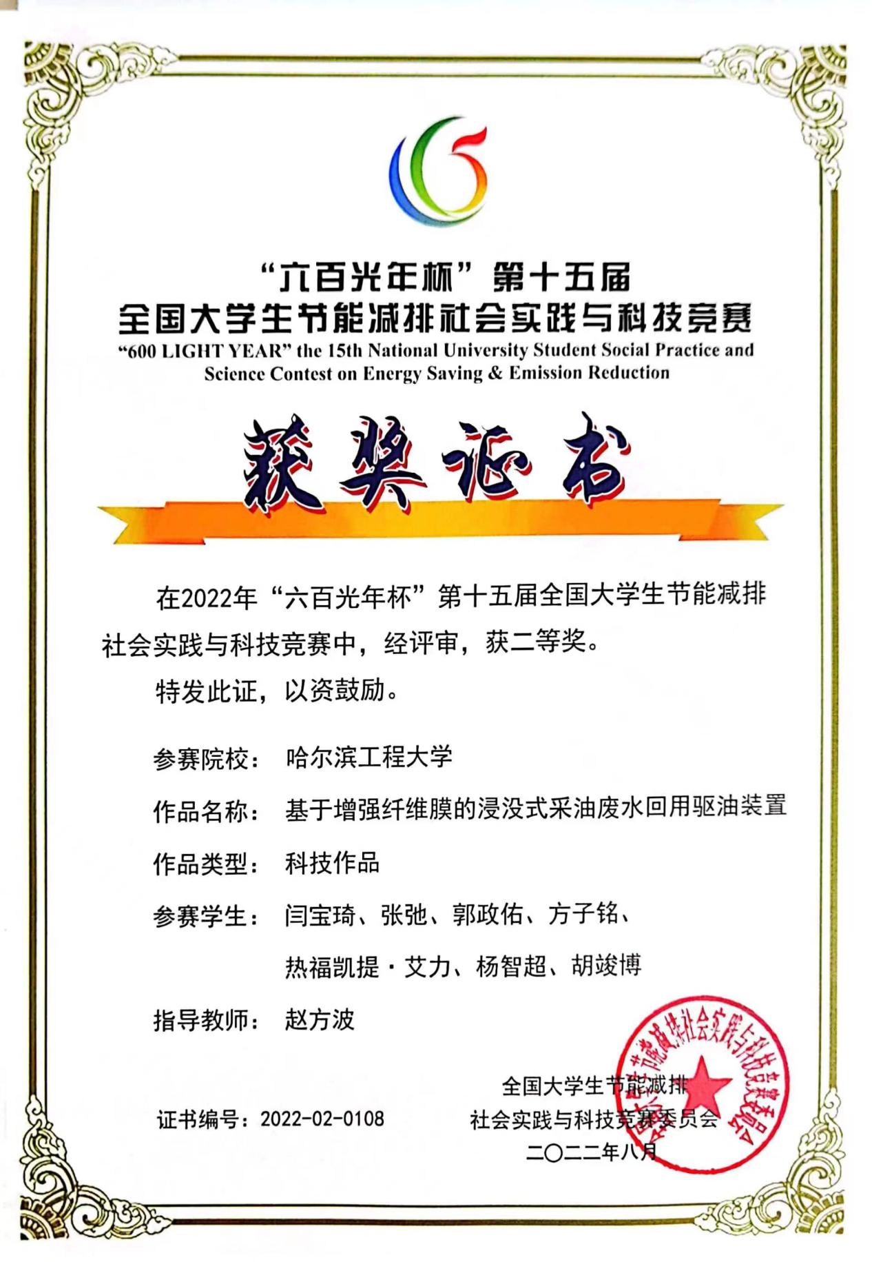 由赵方波老师指导,闫宝琦、张弛、郭政佑、方子铭、热福凯提·艾力、杨智超、胡竣博组成的“强纤超滤”团队完成的《基于增强纤维膜的浸没式采油废水回用驱油装置项目》获得全国二等奖。