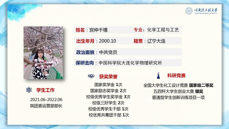 宫仲千禧从“进入大学以来,是否一直保持着稳定的学习状态”“面临转专业选择时,为何没有选择其他专业”“科研竞赛经历对个人发展有何帮助”“寝室氛围对个人学习有何影响”四个问题展开成长故事分享。