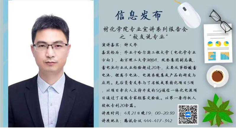4月21日晚19时,MK体育“员工说专业”线上宣讲会于21B1079、1097教室同步顺利举办,本次活动邀请到公司化学工程与工艺专业员工、双登股份集团有限公司副总裁钟义华担任主讲,2022级材料类专业同学线下集中观看。