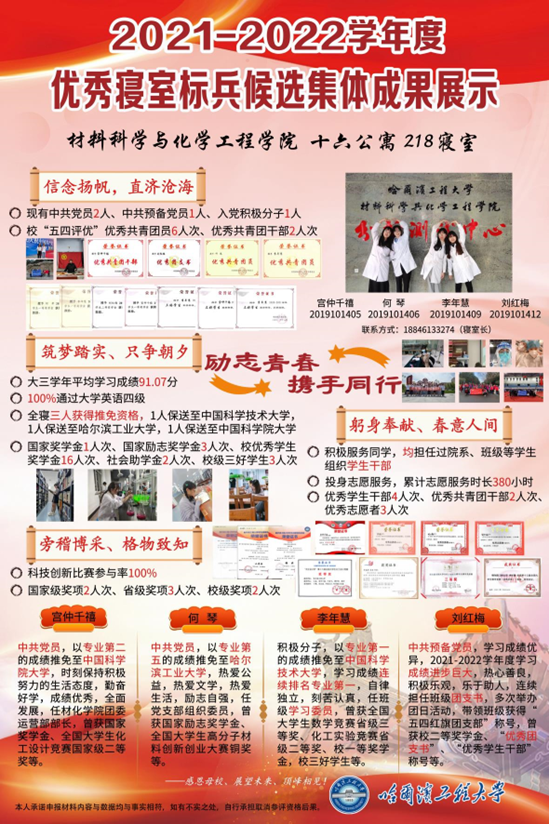 218寝室学习风气优良,三人成功学优推免至外校,一人成功考研本校,大学英语四级全部通过,累计获得国家奖学金1次、国家励志奖学金3次、校级一等奖学金10余次、校级三好员工3次、社会助学金2次。寝室成员积极投身科研,参加全国老员工化工设计大赛、化工实验竞赛、全国老员工高分子材料创新创业大赛、全国老员工数学竞赛、校五四杯等赛事,累计获得国家级奖项2项,省级奖项3项,校级奖项2项。寝室成员在思想上主动要求进步,党员占比75%,担任集团、公司、班级员工干部,累计获得校级优秀员工干部5次。累计志愿服务时长数百小时,累计获得省级、校级优秀志愿者3次。