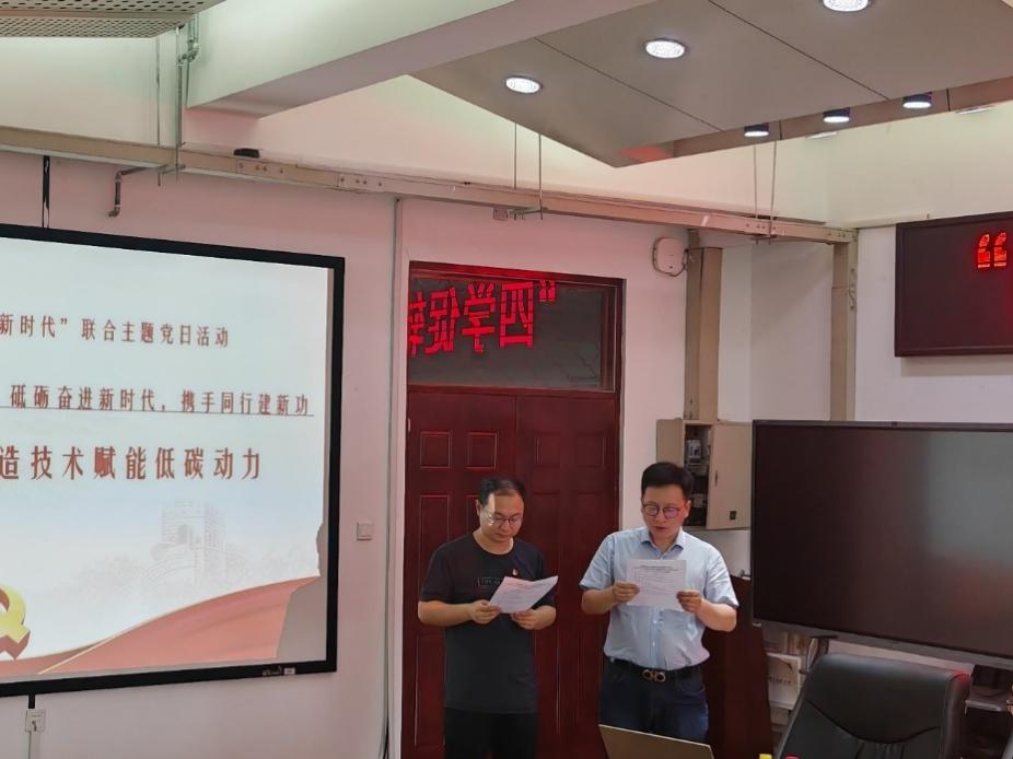 最后,张洋同志和范立云同志共同宣读了“新材料&先进制造技术赋能低碳动力”行动共识,通过双方支部“新材料&先进制造技术赋能低碳动力”系列联合主题党日活动,组织教师党员,深入学习贯彻党的二十大精神,共同践行高水平科技自立自强的使命担当,树立融合发展理念,弘扬追求真理、勇攀高峰的科学精神,以“双一流”建设为引领,共同营造跨学科交流、开放合作的学术生态氛围,强化转型意识,推动转型发展,通过学科交叉融合共同塑造科研事业发展新动能新优势新特色;共同推进教师党支部实现教育党员有力、管理党员有力、监督党员有力和组织群众有力、宣传群众有力、凝聚群众有力、服务群众有力;共同推进“五个一”党建业务融合和双基一体化建设,把教师党支部建设成为“双一流”建设的坚强战斗堡垒,为公司高水平科技自立自强提供有力支撑。