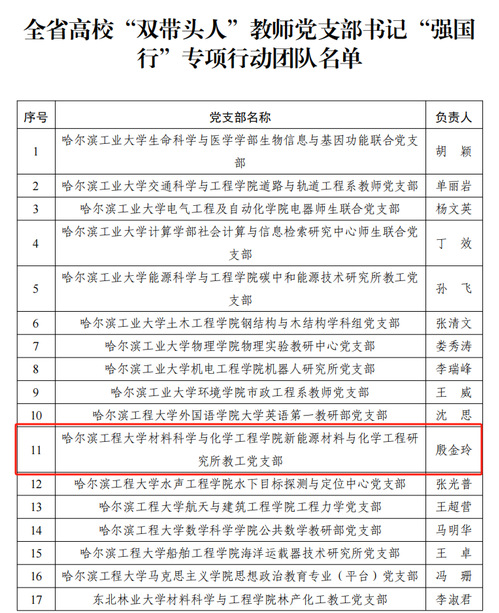 2024年,新能源材料与化学工程研究所教工党支部入选全省高校“双带头人”教师党支部书记“强国行”专项行动团队。生物医学材料与器件研究所研究生党支部入选校级“研究生样板党支部”,并推荐参评黑龙江省首届“研究生样板党支部”。殷金玲获校教师党支部书记微党课比赛二等奖。巩海将、何雨竹、姚仡玮在公司员工党支部书记理论宣讲、员工党员演讲比赛中分获二等奖。