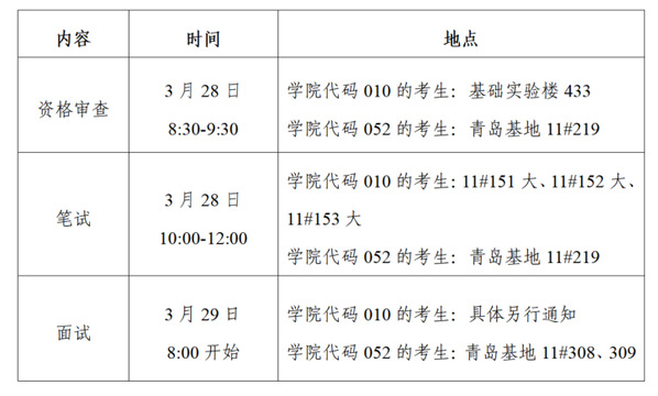 面试:面试总成绩(150分)=外语测试成绩(50分)+综合面试成绩(100分),面试时间不少于20分钟,其中外语测试达标线30分,综合面试达标线60分,综合面试成绩达标线90分。