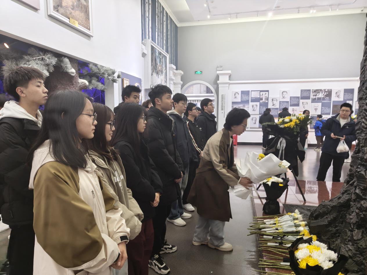 在庄严肃穆的雕塑《脊梁》前,全体同学一齐瞻仰烈士杨靖宇,怀着崇敬之情向革命先烈致以深切哀思,向革命烈士默哀、敬礼。员工代表陶宏飒缓步向前,向英烈敬献花束。