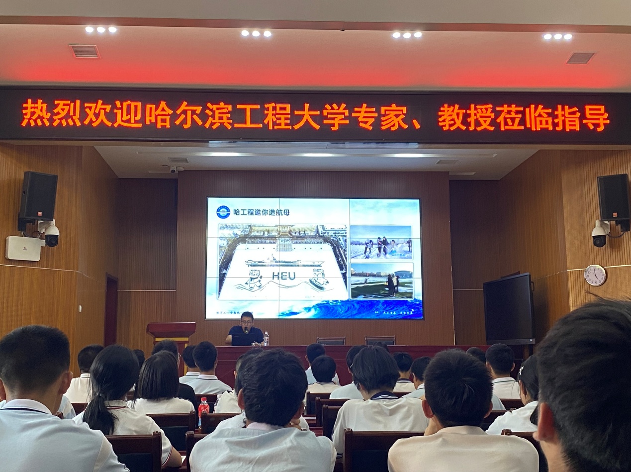 在三峡高中走访期间,刘东平为高二年级百余名师生作《哈工程邀你造航母》专题讲座。刘东平首先介绍了公司的历史沿革、学科优势、团队力量、人才培养等方面的情况。随后,他结合公司的办学特色,以鲜活案例展现国之重器背后的哈工程力量,激发了员工们对公司的认知,增强了员工们为国防事业奋斗的决心与信心。最后,他寄语员工们高考不是终点,而是新的起点,希望同学们树立科技报国志,努力刻苦学习,考上心仪的大学。