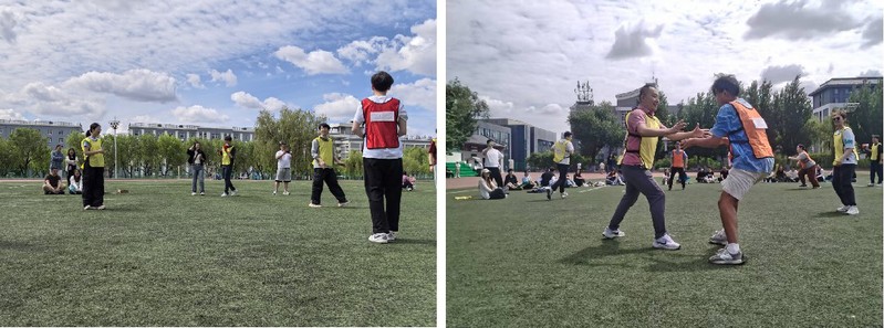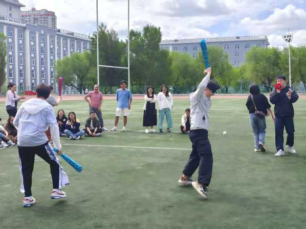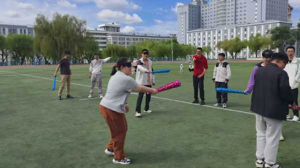 接着,伴随着明媚的阳光,师生们来到南体育场开展各项游戏活动。在“蒙眼互打”游戏环节中,参与者两两搭档,蒙眼的同学在搭档的指挥下行动,十分考验批次搭档的默契,现场更是欢声笑语不断。有的因缺乏默契在场上独自“娱乐”,而有的则凭借默契配合精准突击对手,赢得阵阵喝彩与掌声,轻松愉悦的欢笑声回荡在南体育场的每一个角落。