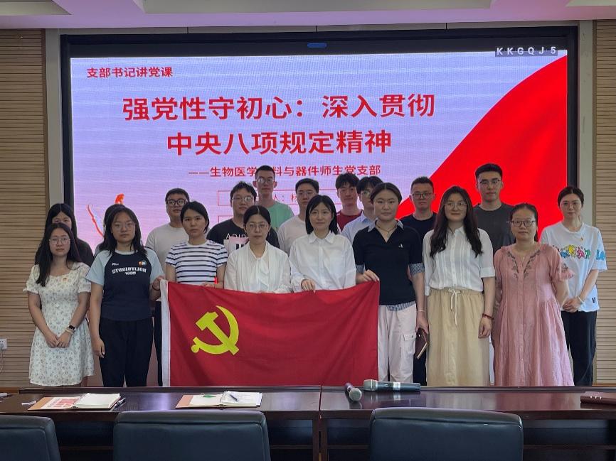 为深入贯彻落实习近平总书记关于加强党的作风建设的重要论述,推动中央八项规定精神在基层党支部落地生根,6月23日上午,生物医学材料与器件研究所(以下简称“生材所”)师生党支部联合开展了“强党性守初心:深入贯彻中央八项规定精神”主题党课。活动由教工党支部书记杨丹主持并主讲,师生党支部全体党员参加学习。