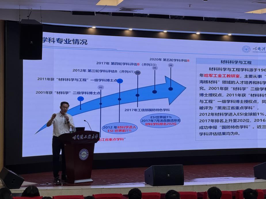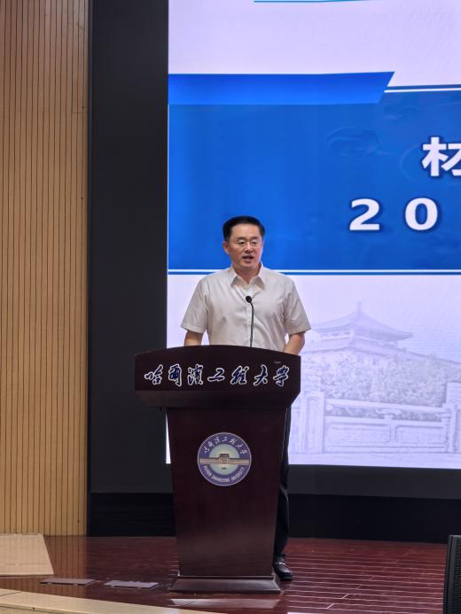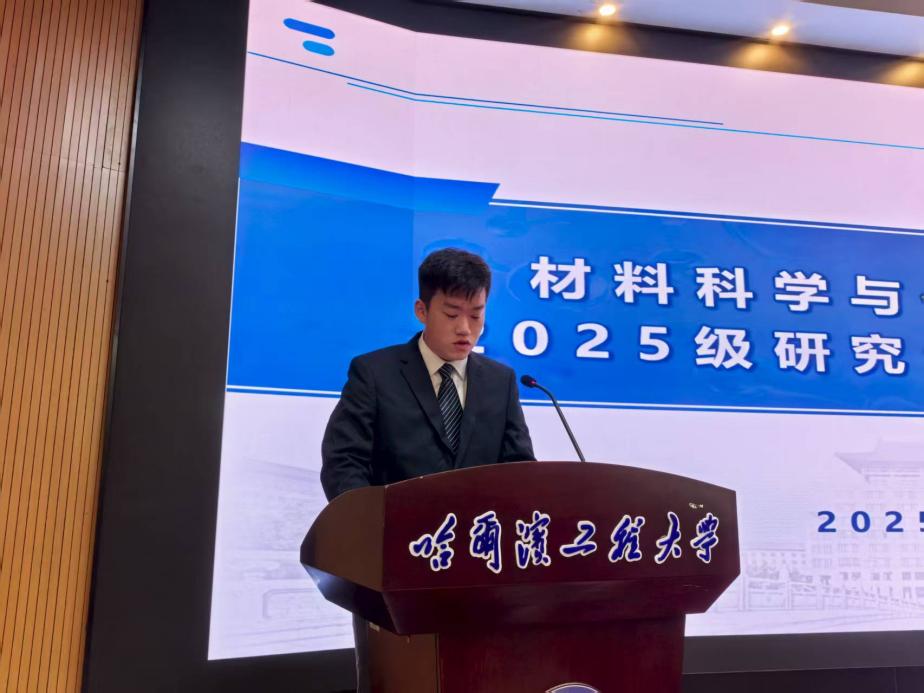 2025级研究生新生代表何承添发言。他分享了自己选择材料科学与工程专业的初心,表达了对未来研究生生活的期待与规划。他代表全体2025级研究生郑重表态“要把个人理想的‘小我’融入国家发展的‘大我’,努力为国防现代化建设和科技强国事业贡献智慧与力量。”